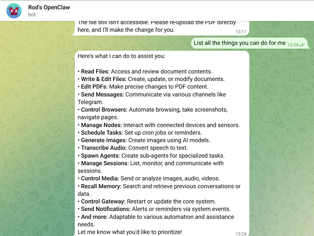 OpenClaw becomes powerful through skills. Skills define what the agent can do beyond text generation.