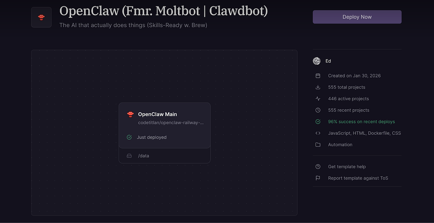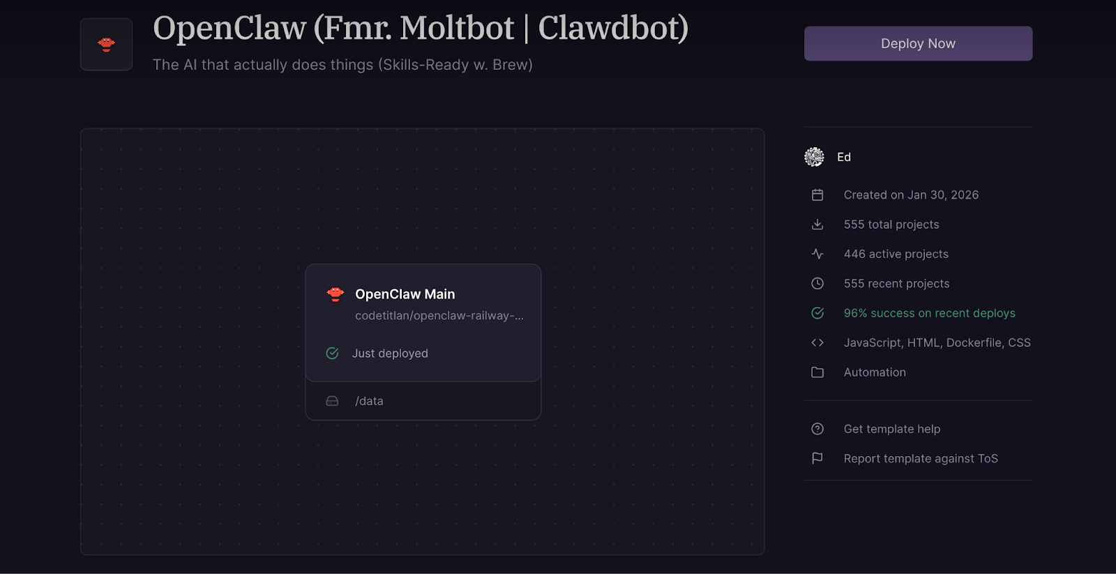 Today, deploying OpenClaw can be as simple as a one-click template. After deployment, onboarding walks you through: